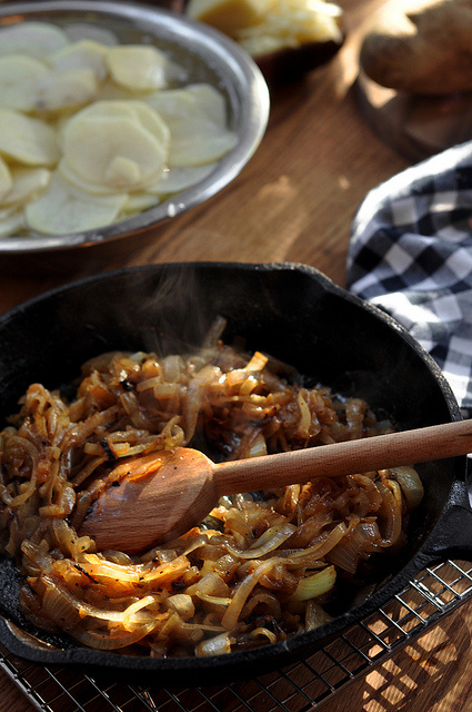 4. Using a medium, deep baking dish, layer the sliced potatoes to completely cover the bottom. Top with some of the caramelized onions, and ladle a bit of the warm cream over. Sprinkle with grated Romano cheese and repeat the steps until all the onions, cream and potatoes are used. Make sure to finish off with a layer of potatoes. Using a spatula, press down on the potatoes to allow the cream to rise to the surface. Sprinkle with remaining Romano cheese and gruyere cheese. Add a bit of freshly cracked black pepper if desired. Bake for about 35 to 40 minutes or until the potatoes are tender, the cream is bubbling and the cheese on top is browned.