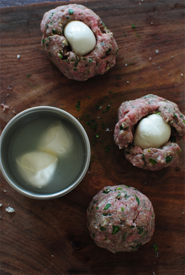 So then, divide the meat into four enormous meatballs. Using your thumbs, press a hole in the center of each mound, and place the small mozzarella ball right in the center. Fold and press the meat around the cheese, covering the hole completely.