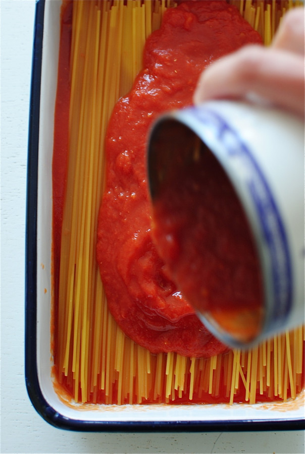 Pour a little of the tomatoes into the bottom of a 9×13 baking dish. (8×10 works, too!) Place the dried spaghetti right on top and pour the rest of the sauce over the noodles, covering every noodles.