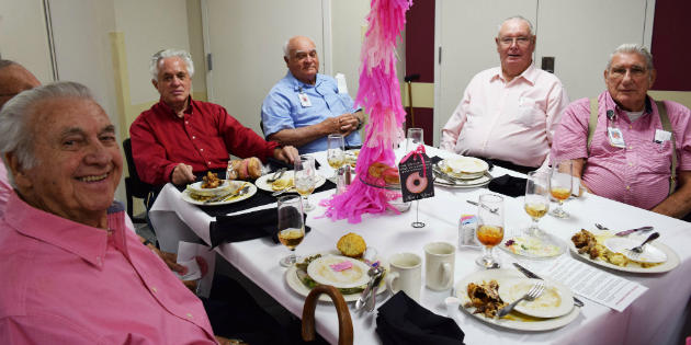 A few of SGMC’s Volunteer “Red Coats” Bob Harris, Howard Brock, James Biles, Lewis Herrin, and Bob Tlusty enjoy a luncheon honoring auxiliary members on May 11.