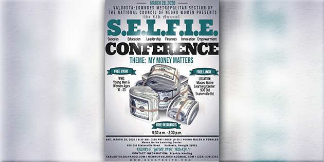 VALDOSTA, GA – The Valdosta-Lowndes Metropolitan Section of NCNW, Inc. is hosting its 6th annual S.E.L.F.I.E. (Success, Education, Leadership, Finances, Innovation and Empowerment) Conference for young ladies and men ages 16-25 years old. This years theme is, “My Money Matters.”  There will be free resources and a free lunch.  The event will be held on Saturday, March 28th from 9:30 am to 2:30 pm at the Maceo Horne Learning Center located at 930 Old Statenville Road in Valdosta, Georgia.  There will be engaging activities related to financial literacy, writing and balancing a checkbook, what to look for in making major purchases such as real estate and much more.  For more information contact the section at ncnwofvaldosta@gmail.com or call 229-234-2353.
