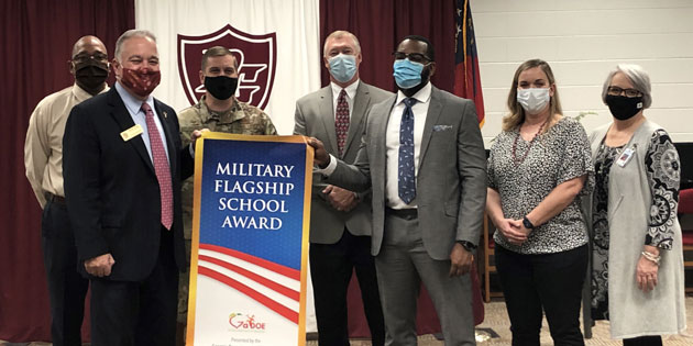 Congratulations to Pine Grove Middle School (PGMS) for being one of seven schools in the state selected as a 2020-2021 Georgia Military Flagship School. State Superintendent, Richard Woods, visited PGMS on March 2, 2021, to present them with the award banner. This award recognizes schools that go above and beyond to provide a supportive environment for military students and their families. Military Flagship Schools provide specific outreach to military families and recognize and accommodate their unique needs. Schools are chosen through a yearly application process that is open to every school in the state. Applications are reviewed by members of the Military Interstate Children’s Compact Commission. Lowndes High School was a recipient of this award last year.