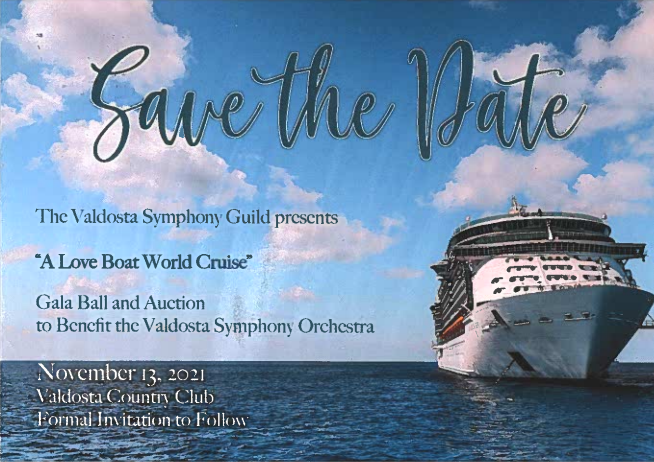 The Valdosta Symphony Guild will host the A Love Boat World Cruise Gala Symphony Ball and Auction on Saturday, Nov. 13, at the Valdosta Country Club. The doors will open at 6:30 p.m., followed by dinner, dancing and auction at 7:30 p.m.
