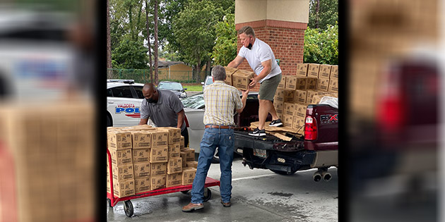 Photo: Christopher Vinson, Bryan McLain, and Randy Register unloading Lysol wipes.