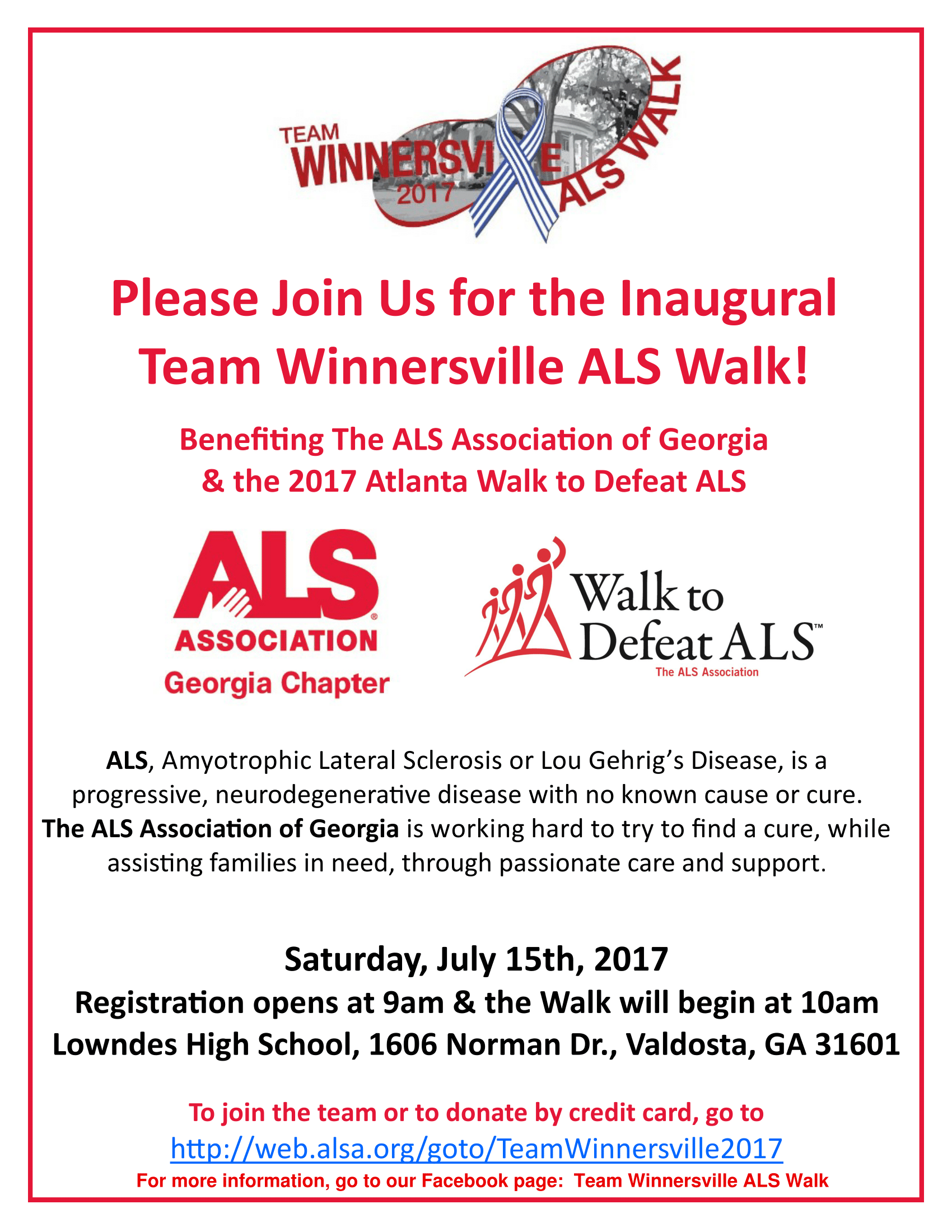 Visit http://web.alsa.org/goto/TeamWinnersville2017 and click on “Join Team” at the top. We are offering a free t-shirt at the gate for all of the people who register and raise $25 on their page.