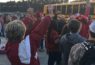 As the team came out headed for the parked buses, the crowd yelled and wagged homemade signs, cheerleaders shook their pompoms and all manner of hugs and back-pats and fist bumps and high fives went around.