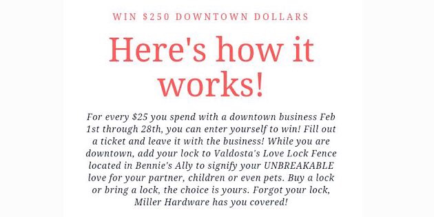 Love Downtown Valdosta is a campaign to get citizens to visit the downtown shops and restaurants. For every $25 spent, citizens will be entered into a drawing to win a $200 in Downtown Dollars. “Spend a little bit, win a lot, is what we’re trying to do with this promotion. Encourage shopping small and local, spending in these shops and restaurants,” said Rachel Thrasher, Main Street Program Coordinator. “We wanted to create a promotion that would encourage them to spend and also give them an incentive while doing so.”