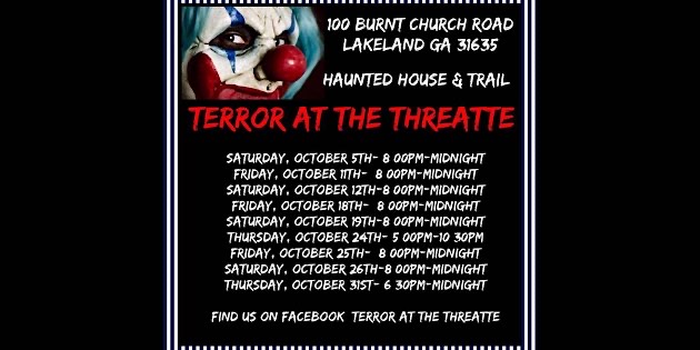Terror at the Threatte, Lakeland is another favorite of ghouls all over South Georgia. Located at 100 Burnt Church Road in Lakeland, it is a Haunted House & Trail. See dates and times below.