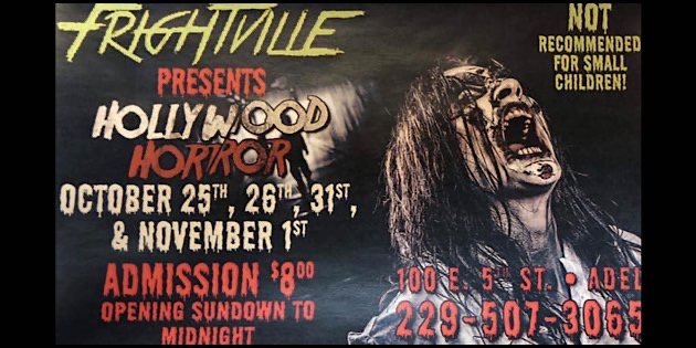 Frightville in Adel off Highway 41, 100 e 5th St. (229-507-3065), from 7:30 p.m.-12 a.m. on October 25, 26, 31 and Nov. 1