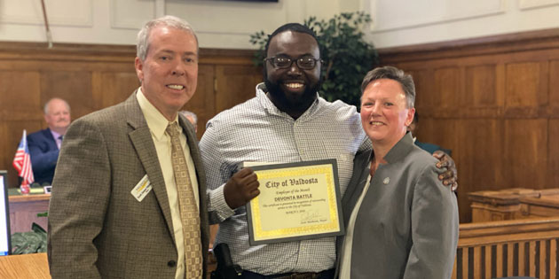 Valdosta Mayor Scott Matheson and Police Chief Leslie Manahan honored School Resource Officer Devonta Battle as the March 2020 Employee of the Month at the March 5 City Council meeting. Battle received a framed certificate, a check for $200, and his name appears on a plaque displayed in City Hall.