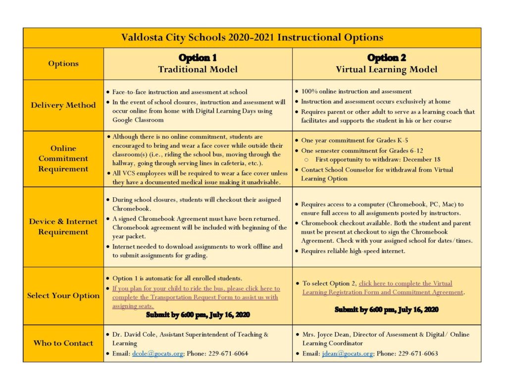 Valdosta City Schools is committed to all students having access to a quality education this fall. We understand the decision on whether to return to a school building or enroll in virtual learning is a deeply personal decision for each VCS student and family. Please read through the options carefully before determining what is best for your family.