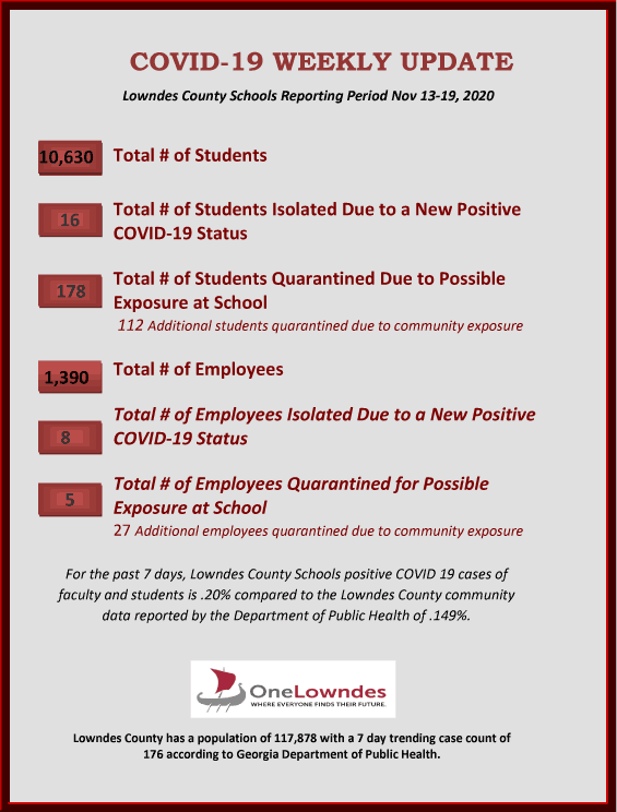 Local NewsNovember 23, 2020 LCS weekly COVID update Share with friends Release: Please see attached, Lowndes County Schools’ weekly COVID-19 update. These numbers are in a trending 7-day format using comparative data from DPH. This report represents data from November 13-19, 2020. TAGS: 19coronaviruscountycovidcovid-19lcsLowndesnumbersschoolsstudentteachervaldosta Related posts Godstock 2025 invites public to…VCS releases important notification on…Turner Center to host 8th…VCS releases statement on bus…Wiregrass Nursing graduates benefits from…City of Valdosta announces leadership…SGBC announces 2025 Small Business…Valdosta City Manager Richard Hardy…Mellow Mushroom celebrates Halloween with…VCS announces Statewide School Fire…