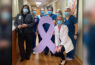 Photo cutline: Staff at the SGMC Pearlman Cancer Center show their support for the day by taking pictures with a lavender ribbon to represent all forms of cancer.