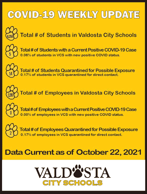 The graphic below reflects all COVID-19 data that was reported to us from Saturday, October 16 through Friday, October 22.  On Monday, November 1, we will post data that reflects Saturday, October 23 through Friday, October 29, 2021.