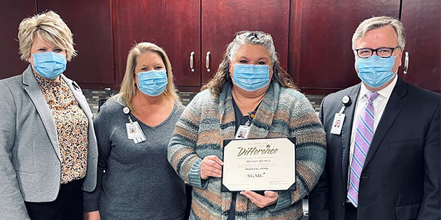 Photo: SGMC Chief Human Resources Officer Brenda Alexander, Director of Practice Management Carol Ingram, Practice Manager and Hospital Hero Wendy Benka, and President and Chief Executive Officer Ronald E. Dean.