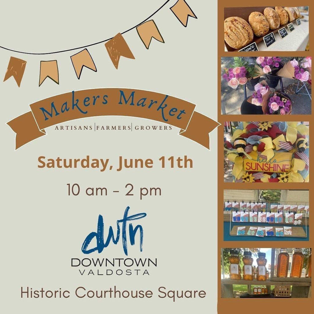 The Makers Market will be at the Historic Courthouse Square in Downtown Valdosta on Saturday, June 11th from 10 am -2 pm. The market will feature products grown and made by local artisans, farmers, and growers. The event is free for the public.