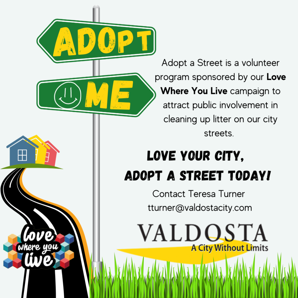 Follow the link for more information and to sign up for Love Where You Live: https://www.valdostacity.com/public-works/adopt-a-street