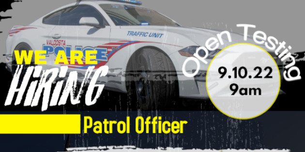 Applications for the position of police officer remains open and dates and times of entry level test will be posted periodically on the City of Valdosta website www.valdostacity.com. For information on the process and benefits email Lieutenant Sabrina Smith at swsmith@valdostacity.com or call her at 229-293-3099.