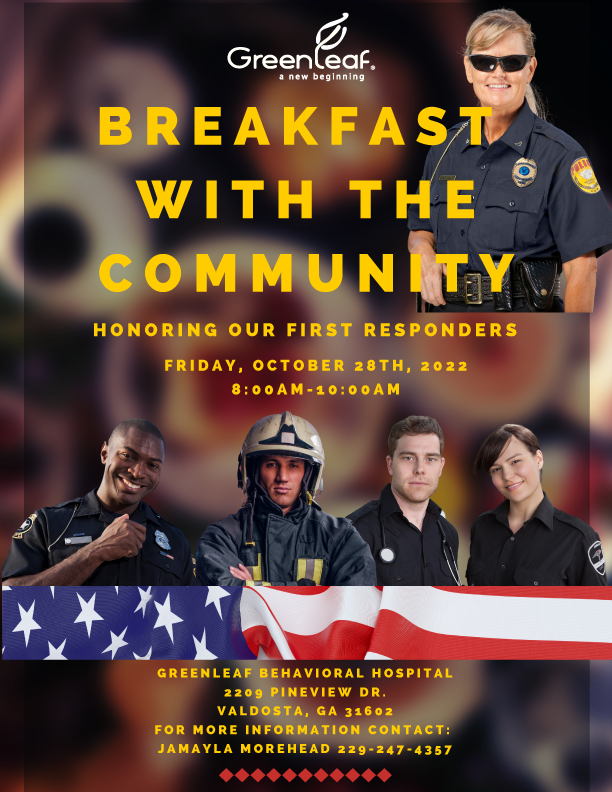 Greenleaf Behavioral Health Hospital will be hosting Breakfast with the Community event honoring our first responders on October 28, 2022 from 8am until 10am at 2209 Pineview Drive, Valdosta, Georgia.