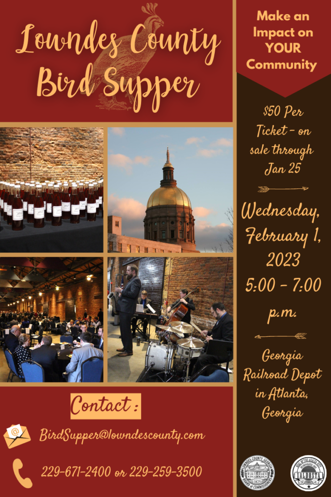 Tickets are on sale for the 2023 Lowndes County Bird Supper, scheduled for Wednesday, February 1, 2023, at the historic Georgia Railroad Depot, in Atlanta, beginning at 5 p.m. The traditional event, sponsored by the Lowndes County Board of Commissioners and the City of Valdosta, brings together hundreds of state officials and local businesses, professional and government personnel for a dinner of quail and meaningful conversations.