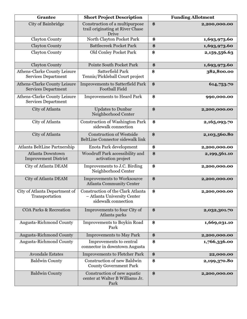 Governor Brian P. Kemp announced preliminary grant awards totaling more than $225 million for 142 qualified projects that improve neighborhood assets like parks, recreation facilities, sidewalks, and healthy food access in communities all across the state disproportionately impacted by the COVID-19 pandemic.