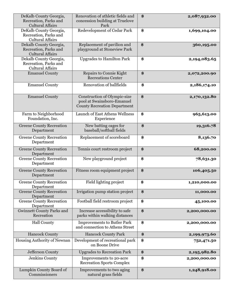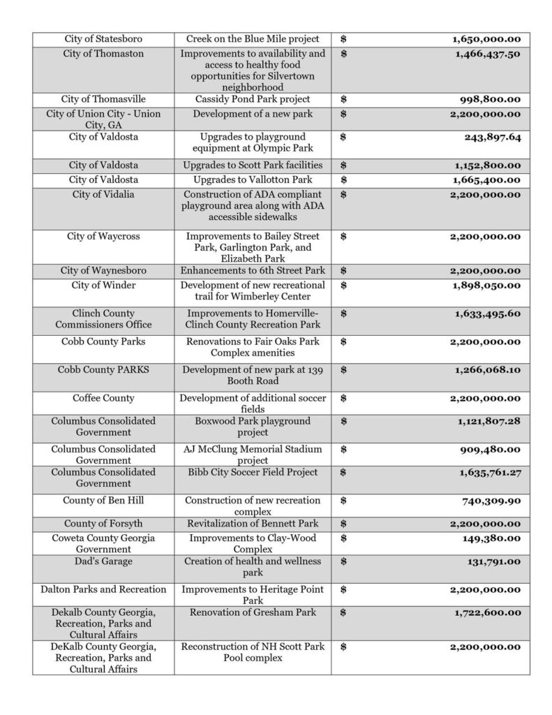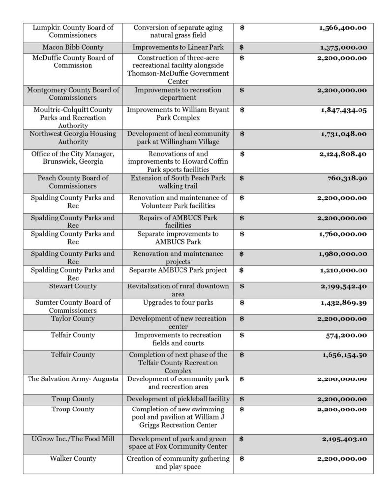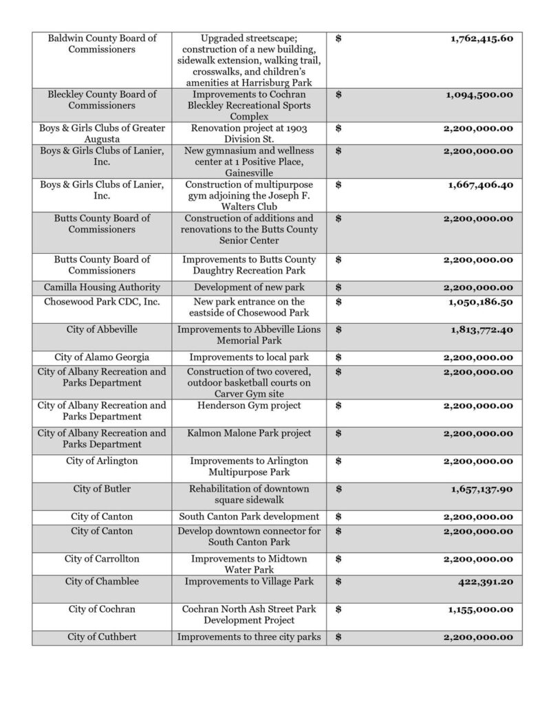 “I appreciate Governor Kemp’s careful stewardship in awarding this funding to worthwhile projects in communities across our state,” said Speaker Jon Burns. “Throughout the pandemic, the General Assembly worked shoulder to shoulder with Governor Kemp to protect our citizens and keep our economy moving. We remain committed to working together to see that our best days are still ahead.”