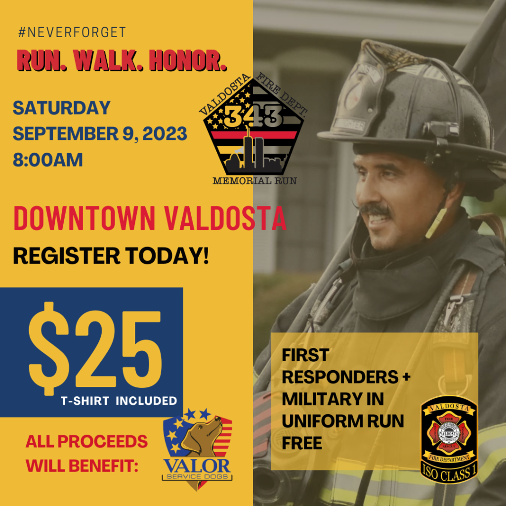 The Valdosta Fire Department will host the annual 9/11 Memorial 5K on Saturday, September 9, 2023 starting at 8am in Downtown Valdosta. Registration is open for $25 with T-shirt included and all proceeds will benefit the Valor Service Dogs. First responders and military in uniform run for free.