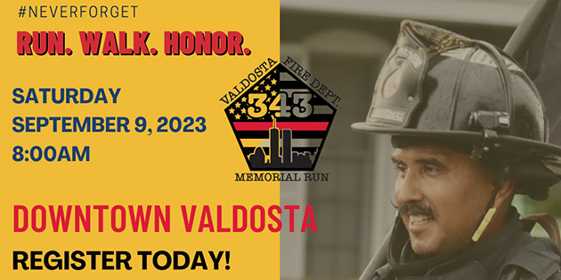 The Valdosta Fire Department will host the annual 9/11 Memorial 5K on Saturday, September 9, 2023 starting at 8am in Downtown Valdosta. Registration is open for $25 with T-shirt included and all proceeds will benefit the Valor Service Dogs. First responders and military in uniform run for free.