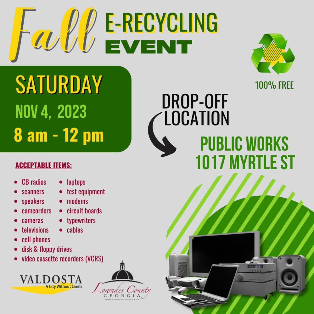City and County Residents can properly dispose of their outdated or unwanted electronics and reduce unnecessary clutter during the upcoming Fall Electronics Recycling Event. The City of Valdosta and Lowndes County Public Works Departments will jointly host the community recycling event on November 4, 2023, from 8 a.m. to 12 p.m. Items can be dropped off at Valdosta Public Works located at 1017 Myrtle Street.