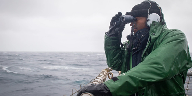Photo: Seaman Chase Jones, from Valdosta, Georgia, stands as lookout watch aboard Arleigh Burke-class guided-missile destroyer USS Hopper (DDG 70). U.S. Navy photo by Mass Communication Specialist 2nd Class Leon Vonguyen