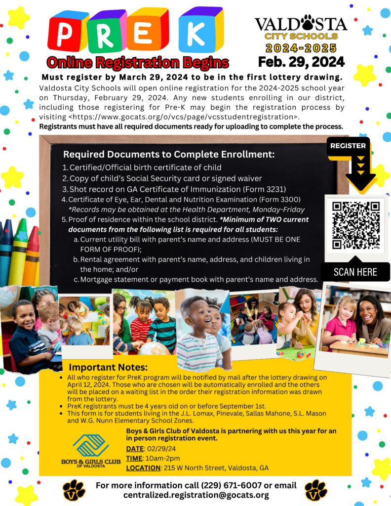 VALDOSTA – Valdosta City Schools releases the PreK and Kindergarten registration schedule for the 2024-2025 school year.