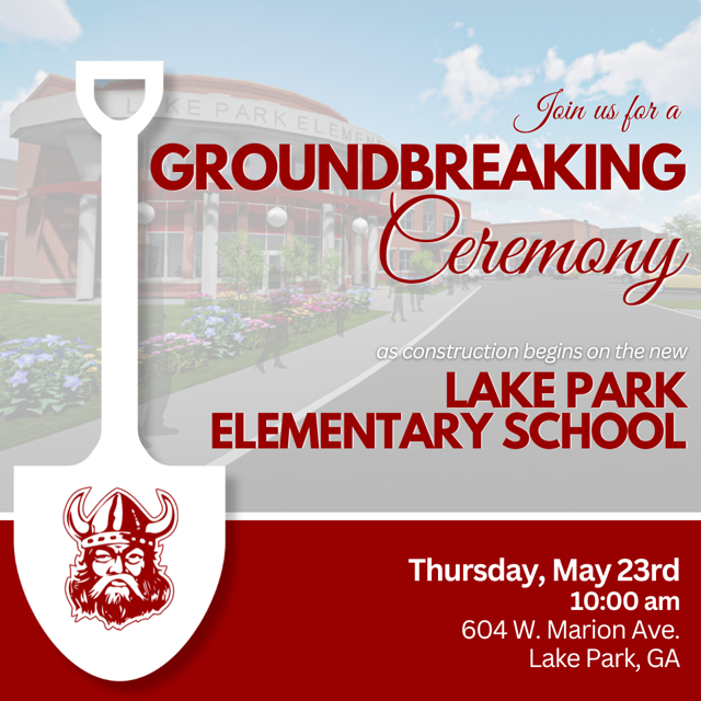 The community is invited on behalf of Superintendent Sandra Wilcher, Lake Park Elementary Principal Lauren Sirmans, and incoming Principal Jessica Stanley to join us for the Groundbreaking Ceremony of the new Lake Park Elementary School! The Groundbreaking Ceremony will be on Thursday, May 23, 2024 starting at 10am located at 604 West Marion Avenue, Lake Park, Georgia.