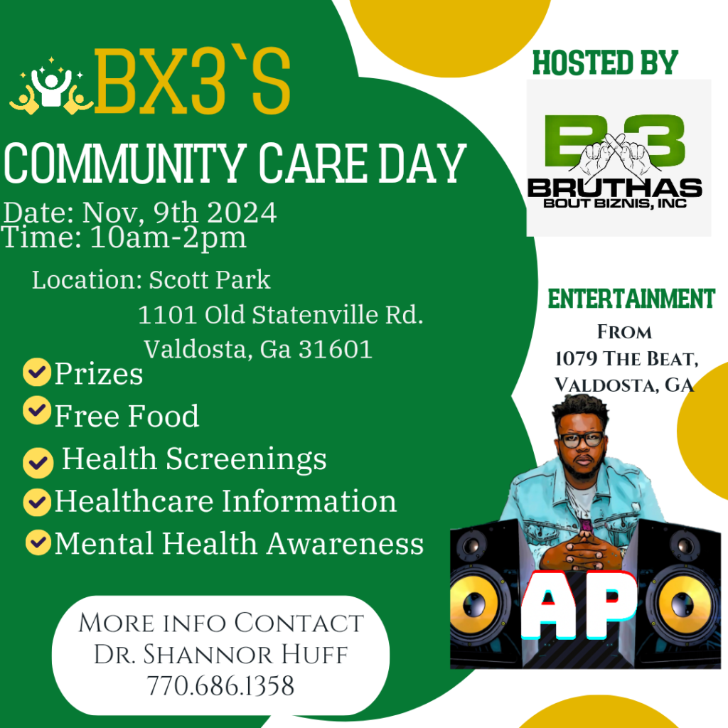 The BX3 Bruthas Bout Biznis, Inc. will host Community Care Day on Saturday, November 9, 2024 from 10 am until 2 pm at Scott Park located at 1101 Old Statenville Road in Valdosta.