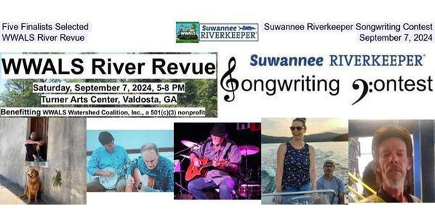The five finalists will play at the Finals of the Suwannee Riverkeeper Songwriting Contest, at the WWALS River Revue, Saturday, September 7, 2024, at the Turner Center for the Arts, in Valdosta, Georgia. The audience and the three judges will watch and listen. The judges will award prizes, and the winner will sing again.