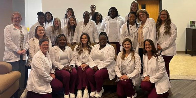 Photo: 1st row seated l-r: Ruth Dominicis, Niesha Taylor, Josie Spires, Tanishya Thomas, Madison Turner, and Jessica Keffer. 2nd row l-r: Pam Jankowski (ASN instructor), Laura Croft, Angelia Edwards, Georgianne Bauer (ASN Director), and Jessica Bell. 3rd row l-r: Briana Stephens, Molly Cromer, Bailey Hughes, Takoria Miley, and Kendal Fender. 4th row l-r: Adasia Zachary, Conner West, Crystal Hill, and Brittany Simmons