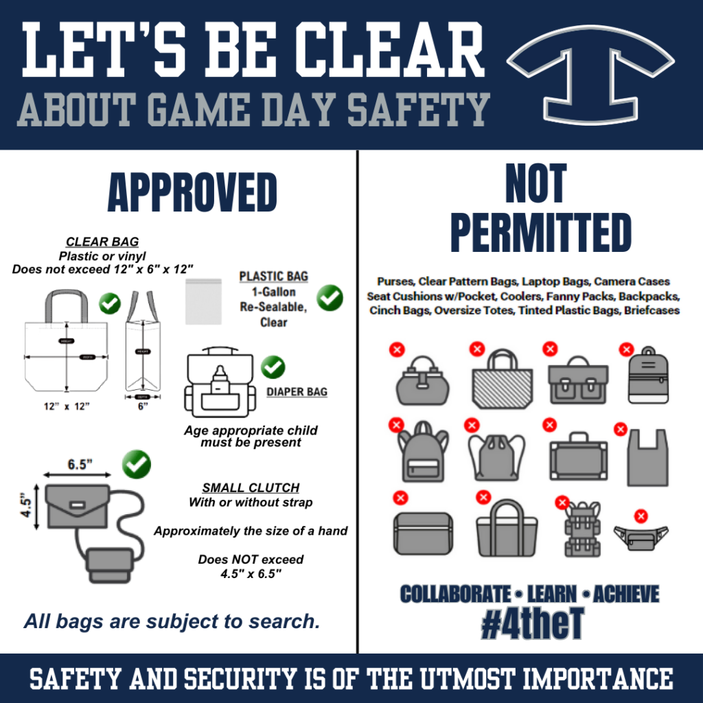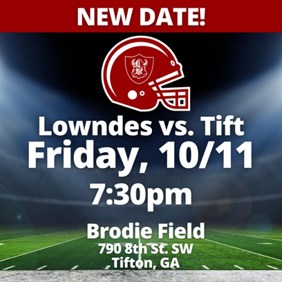 Tickets are on sale for the Lowndes – Tift County game this Friday October 11. This game was originally scheduled for October 4 but has been moved forward a week due to Hurricane Helene. Kickoff is set for 7:30 pm on Brodie Field located at 790 8th Street W in Tifton. Stadium gates will open at 6:00 pm. Tickets are $10 each, for both adults and students, and are for general admission seating. All fans, except babies in arms, must have a ticket to enter. Tift County does have a clear bag policy for fans entering the stadium. A copy is attached.