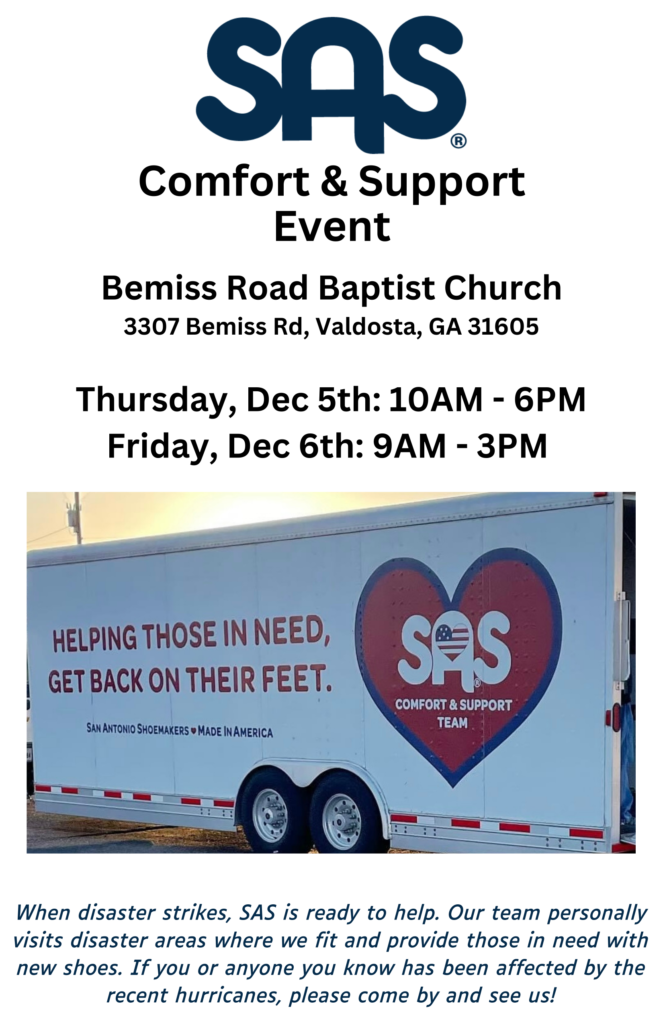 San Antonio Shoes (SAS) will host the Comfort & Support Event on Thursday, December 5, 2024 from 10 am until 6 pm at Bemiss Road Baptist Church located at 3307 Bemiss Road, Valdosta, Georgia.