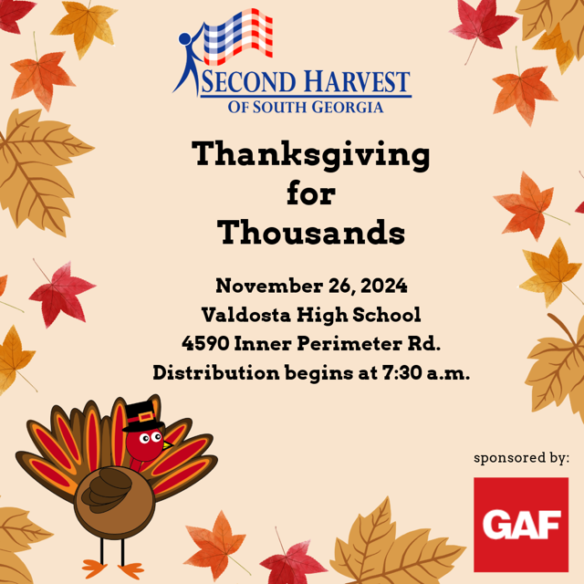 Second Harvest of South Georgia will host the Thanksgiving for Thousands sponsored by GAF on Tuesday, November 26, 2024 starting at 7:30 am. The event will take place at the Valdosta High School located at 4590 Inner Perimeter Road.