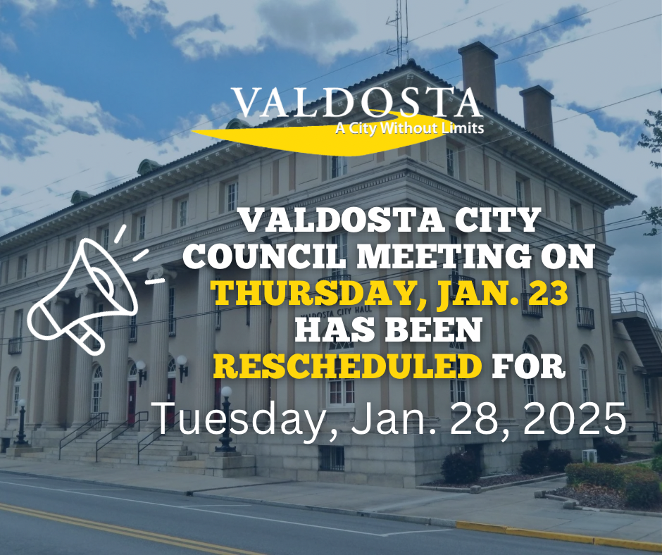 VALDOSTA – The City of Valdosta announces that the Valdosta City Council meeting has been rescheduled for January 28th.