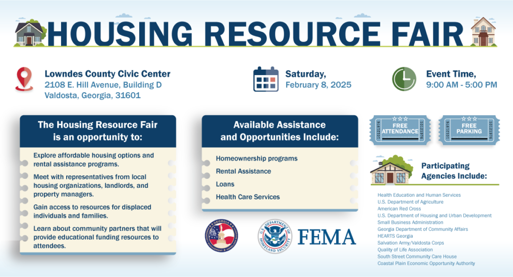 LOWNDES CO – FEMA is hosting a Housing Resource Fair on Feb. 8 in Valdosta to offer services to families recovering from Hurricane Helene.