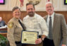 Photo: VPD Commander Stephen Thompson (center) was honored by Mayor Scott James Matheson (right) and VPD Chief Leslie Manahan (left) as the City of Valdosta’s January 2025 Employee of the Month during the Valdosta City Council regular session meeting on Thursday, February 6, 2025.