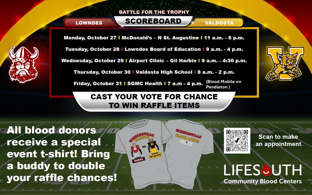This week, SGMC Health and Lifesouth Community Blood Centers are hosting the Winnersville Classic Blood Drive Competition. They will be at Valdosta High School on Thursday, October 30, 2025 from 8:00am – 2:00pm. Please see the list below for other locations available during the week. If you attend another location, be sure to tell them you support the Valdosta Wildcats!