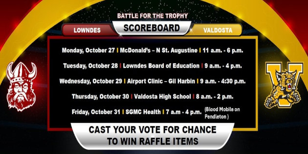 This week, SGMC Health and Lifesouth Community Blood Centers are hosting the Winnersville Classic Blood Drive Competition. They will be at Valdosta High School on Thursday, October 30, 2025 from 8:00am – 2:00pm. Please see the list below for other locations available during the week. If you attend another location, be sure to tell them you support the Valdosta Wildcats!