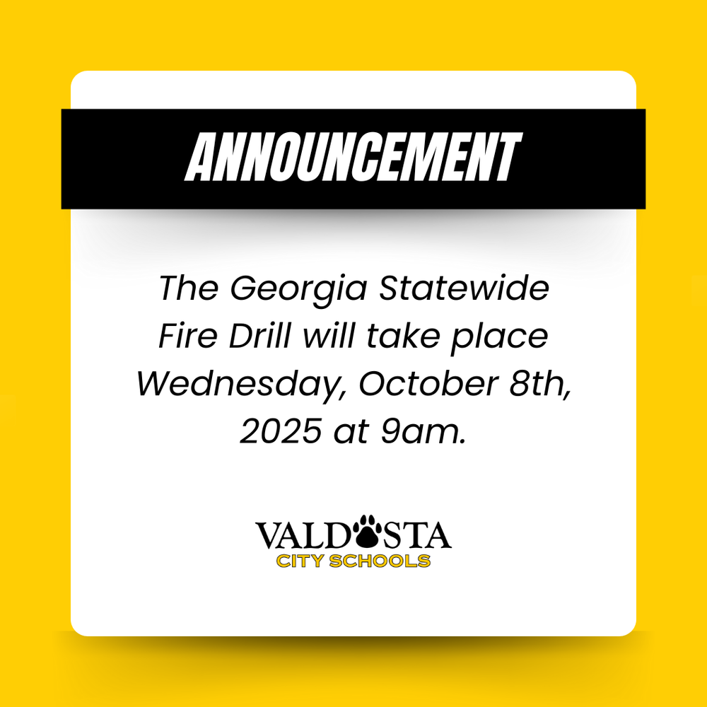 The Georgia Statewide Fire Drill will take place Wednesday, October 8th, 2025 at 9am.