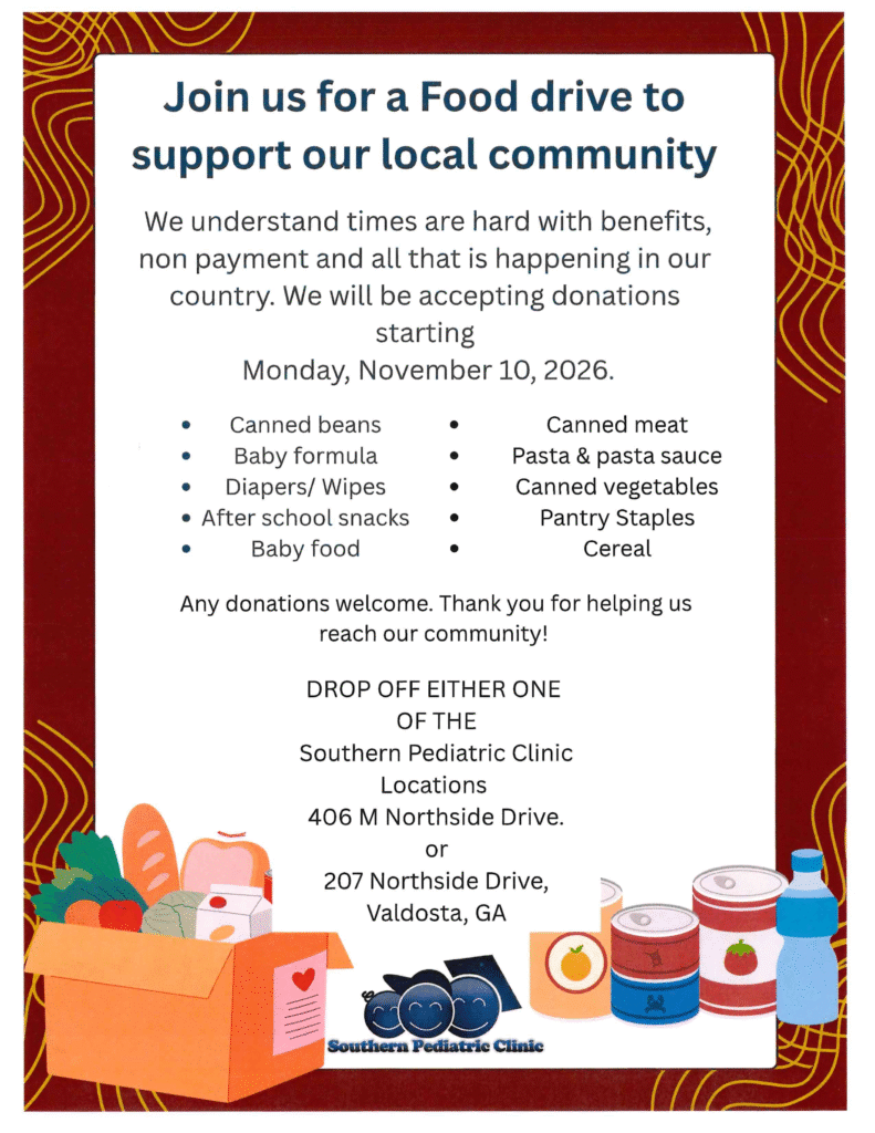 Southern Pediatric Clinic invites the public to a food drive at two locations in Valdosta to help support the local community. The food drive will start accepting donation on Monday, November 10, 2026.