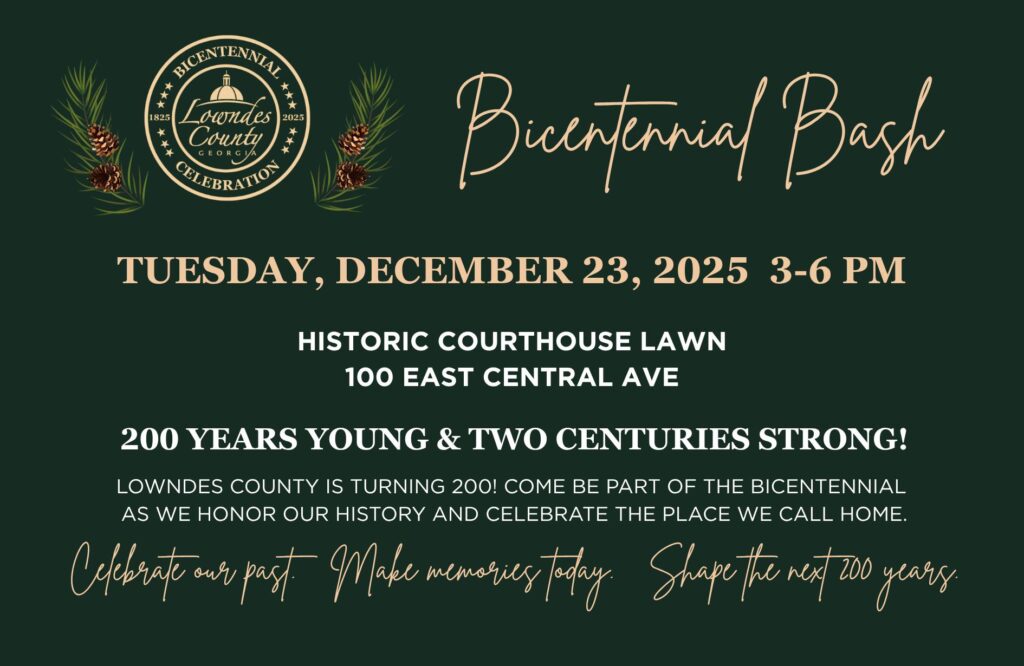 The Lowndes County Board of Commissioners invites the community to celebrate a historic milestone, 200 years of history, community, and progress. The official birthday of Lowndes County is Tuesday, December 23, 2025, and the county will commemorate the occasion with a special Bicentennial Birthday Bash on the Historic Lowndes County Courthouse Lawn.