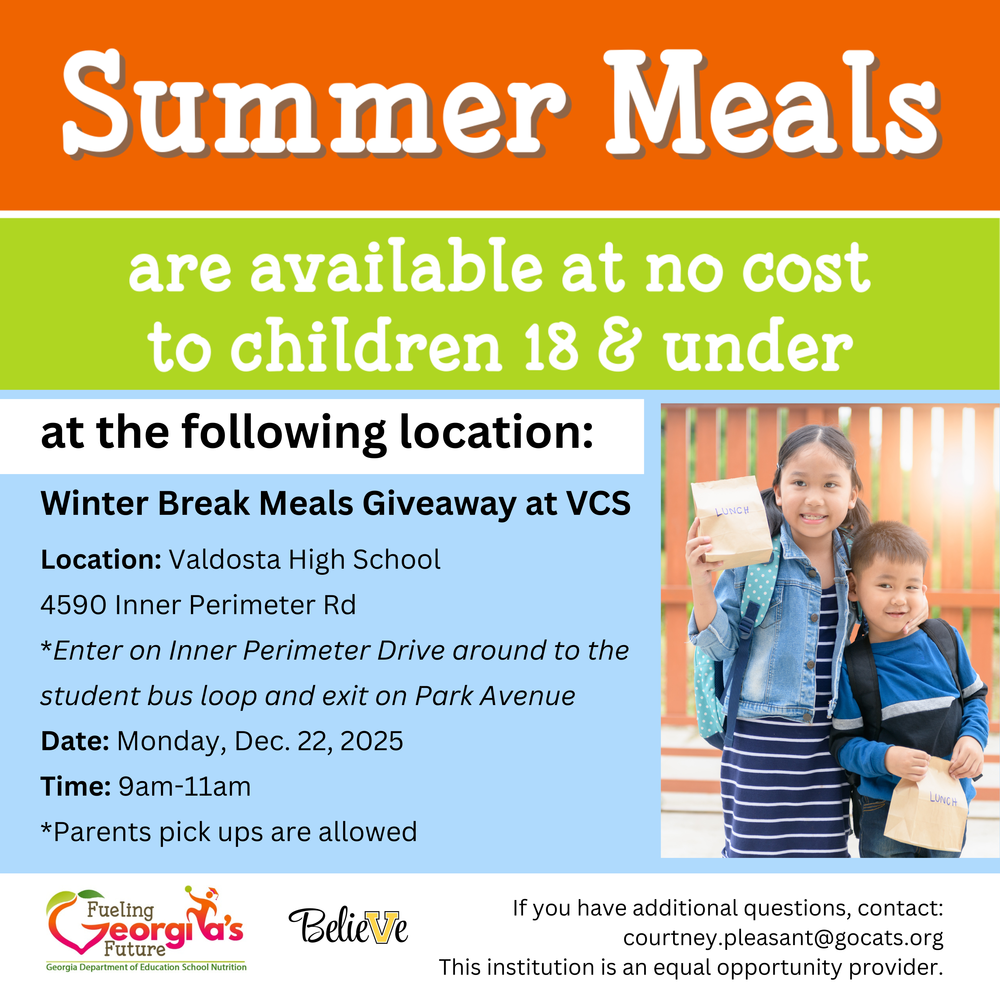 Valdosta City Schools will be distributing free packed lunches for students on December 22, 2025 from 9:00-11:00 AM at Valdosta High School, funded through the Seamless Summer Option Program.