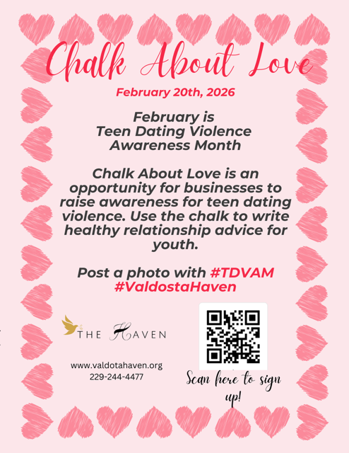 Chalk About Love is a community awareness campaign created to support Teen Dating Violence Awareness Month in February. Its goal is to spark conversations about healthy relationships and help teens recognize what respectful, safe love looks like. We raise awareness by encouraging participants to write messages such as “Love respects boundaries,” “Healthy love feels safe,” or “Consent matters,” with sidewalk chalk on February 20th. These simple statements help spark conversations and remind teens that love should never involve control, fear, or pressure. We would also love everyone to post a picture and use the tags #TDVAM and #ValdostaHaven on February 20th! This is an amazing way to liven up the streets of Valdosta and the surrounding areas! Chalk can be provided upon request via QR Code. Please scan the QR Code attached to our flyer to register for this event.
