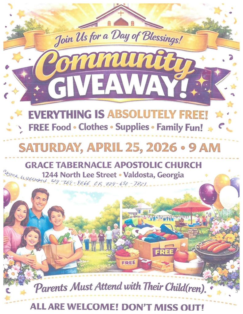 VALDOSTA — Grace Tabernacle Apostolic Church will host its 3rd Annual Community Giveaway on Saturday, April 25, 2026, from 9:00 a.m. to 12:00 p.m.
