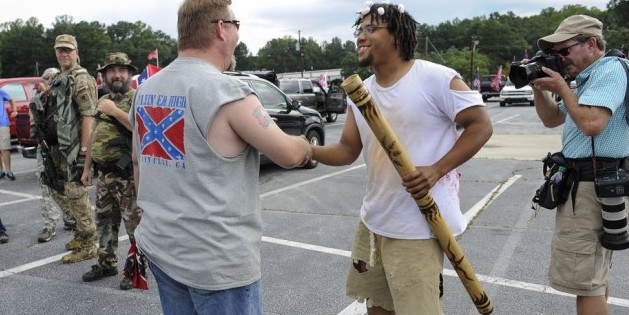 In the park, hundreds, many of them white, had already made their way into the park’s Yellow Daisy lot, some dressed in camouflage and toting rifles. Others like the League of the Confederacy passed out literature. They came from all over the state to protest what they see as an attack on their heritage.